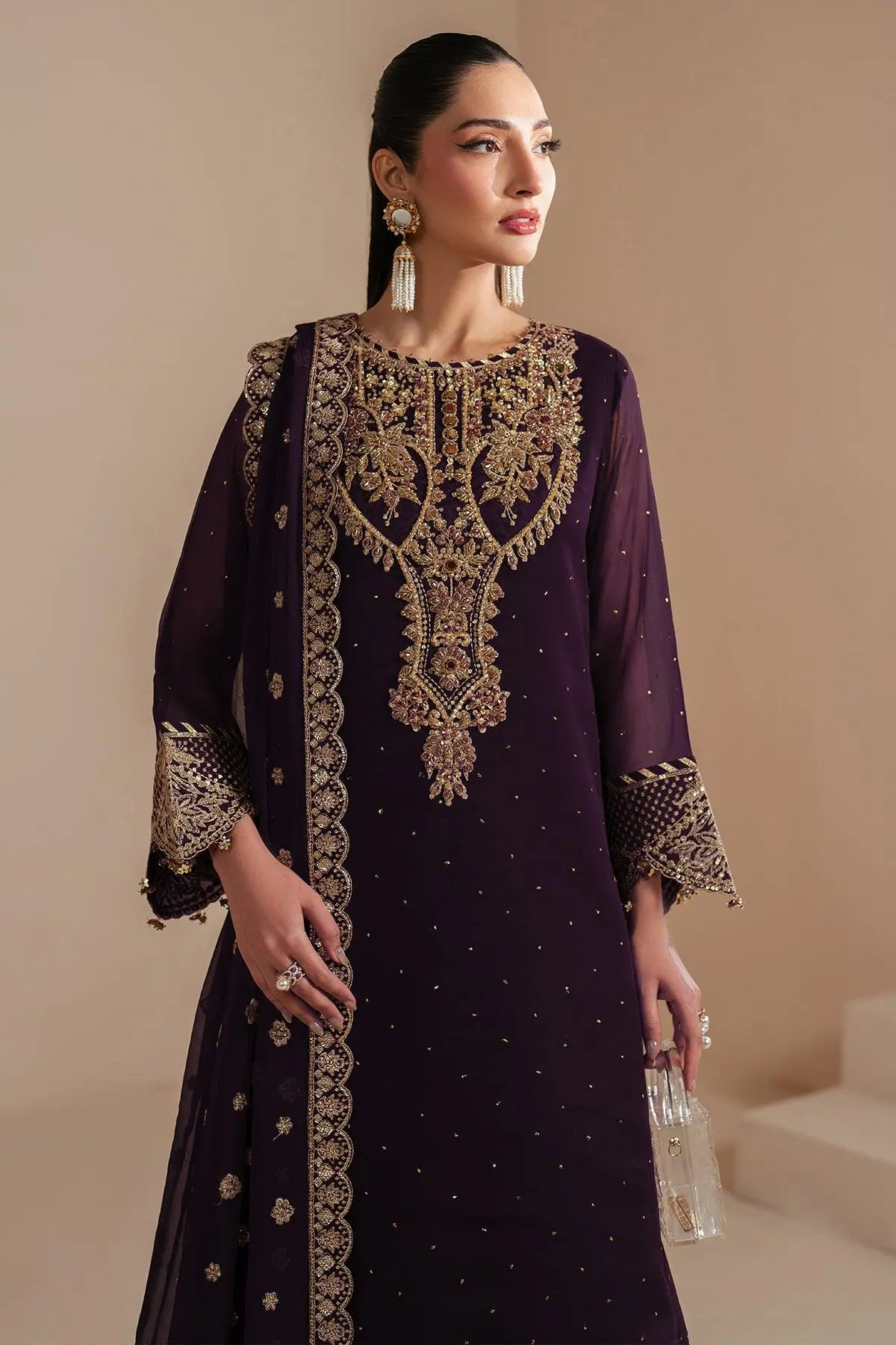Sirus is a stunning ensemble made from rich deep purple chiffon, adorned with delicate hand embellishments, intricate embroidery, and shimmering light gold sequins. The look is complemented by russian grid trousers featuring an embroidered border, perfectly balancing the opulence of the chiffon dupatta. This exquisite outfit is the perfect choice for Eid celebrations.
