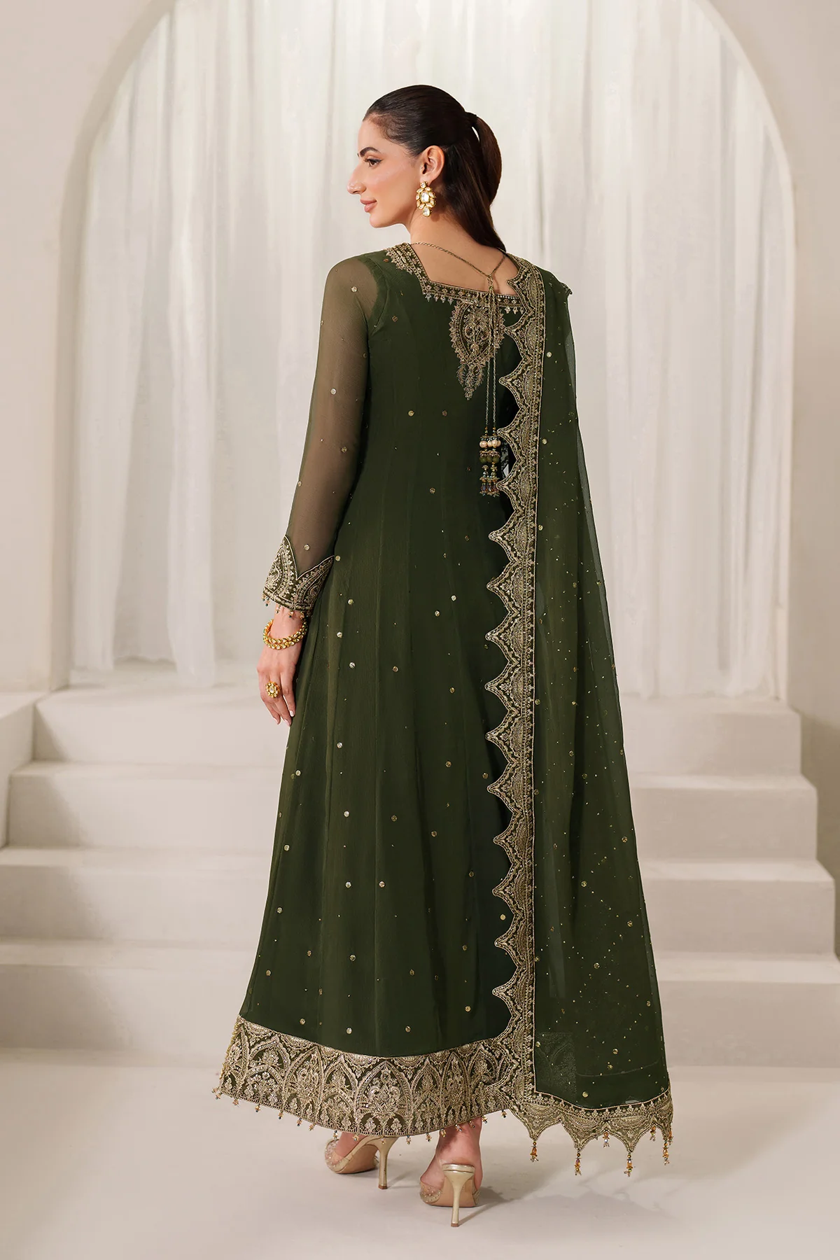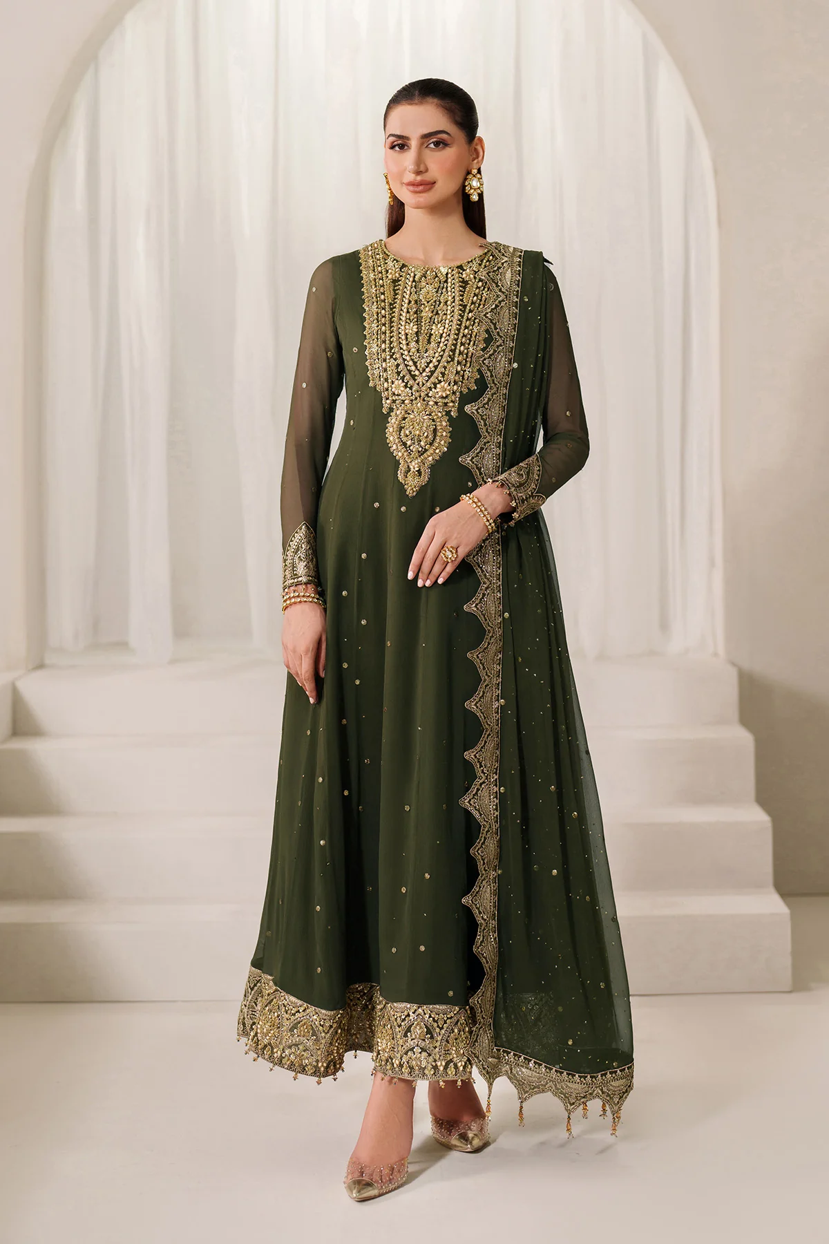 Turn heads in this exquisitely designed deep olive green ensemble, featuring a Mukesh-detailed front panel and black kali accents for added elegance. The sleeves are adorned with delicate Mukesh work, while the neckline is finished with a heavily embroidered patch, adding a regal touch. Finished with a scalloped dupatta and embroidered borders, this outfit is perfect for festive or formal occasions.