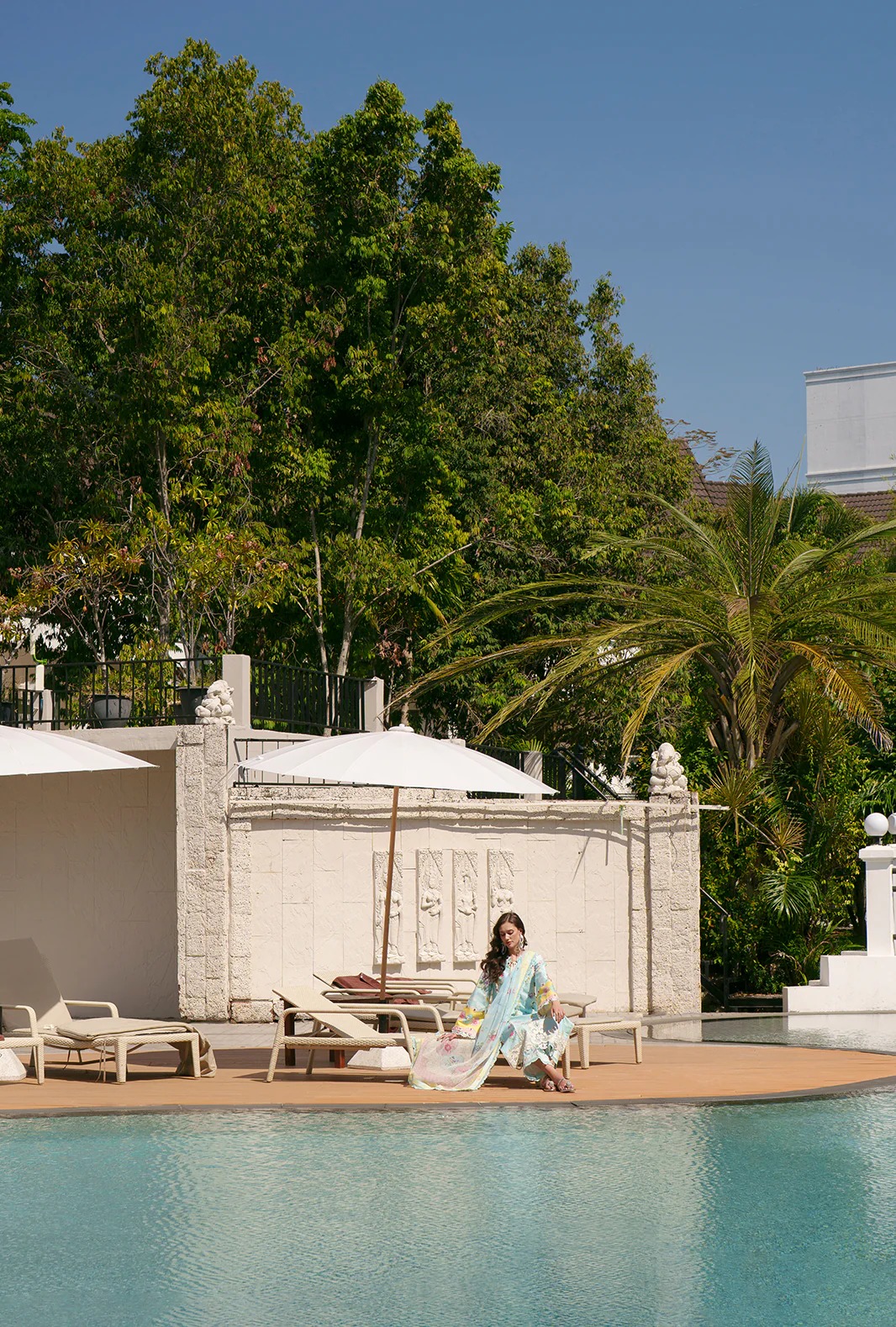 AZURE features a printed lawn shirt beautifully enhanced with delicate Chikankari embroidery on the front, complemented by embroidered shirt front and trouser borders for a polished finish. Printed lawn sleeves and back add a harmonious charm, while printed cotton trousers and a soft chiffon printed dupatta complete this elegant ensemble. Perfect for a graceful and sophisticated look.