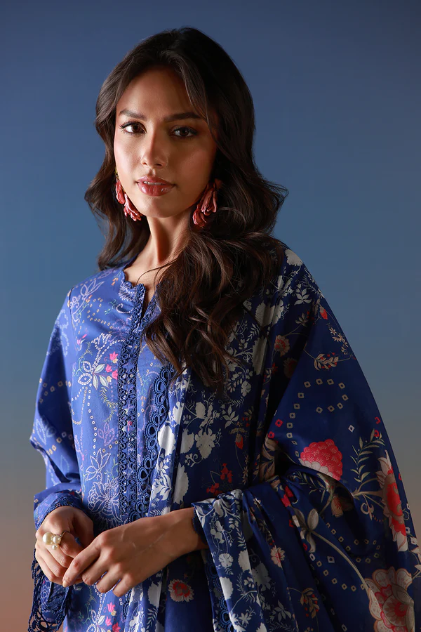 Description: Cobalt blue hues enriched with traditional bandhni motifs and floras. The coordinated shirt and pants feel regal, while the dupatta adds dramatic movement with ivory design elements. A luxurious take on classic elegance.