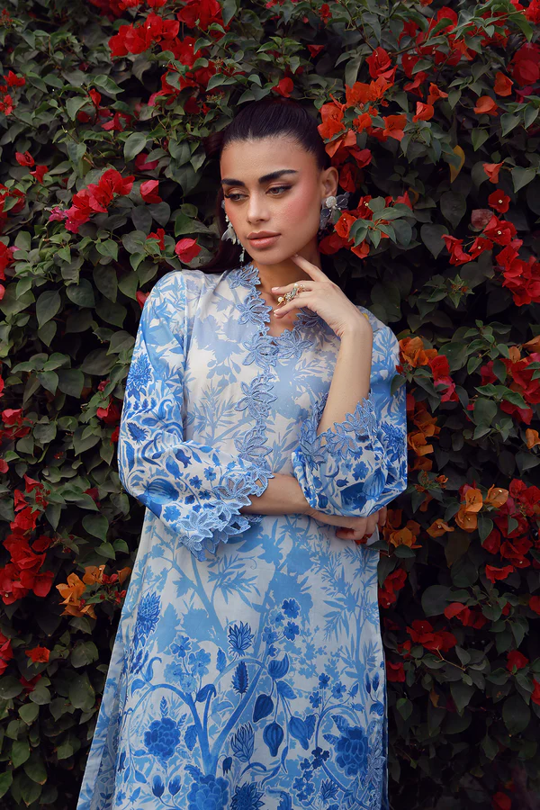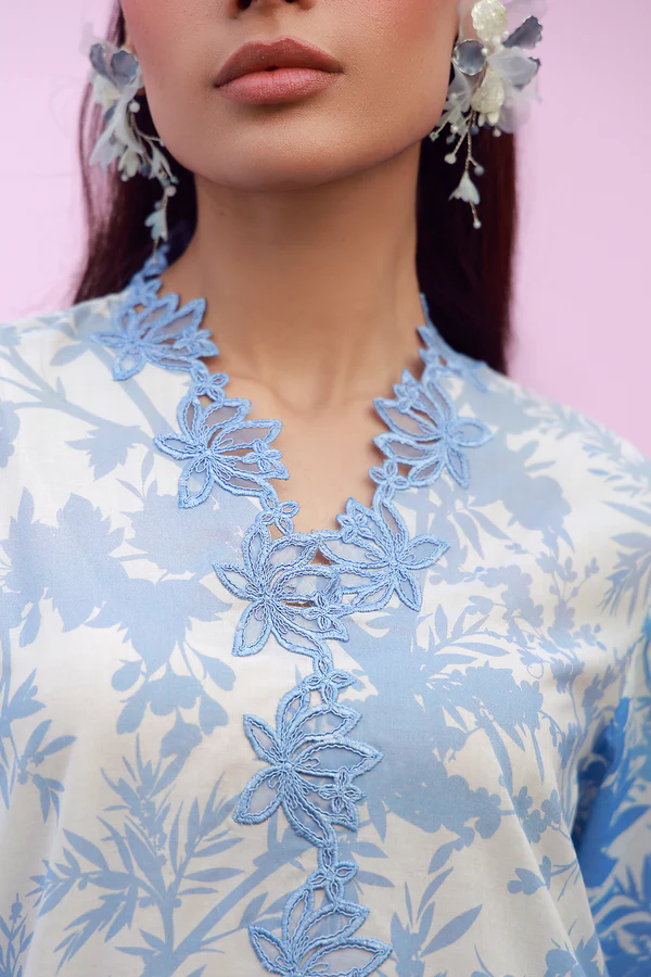 Description: Powder blue meets porcelain whites in a serene botanical story. Flowing florals and soft contrasts lend this print a breezy, almost ethereal quality. A refreshing palette made for light, elegant dressing.