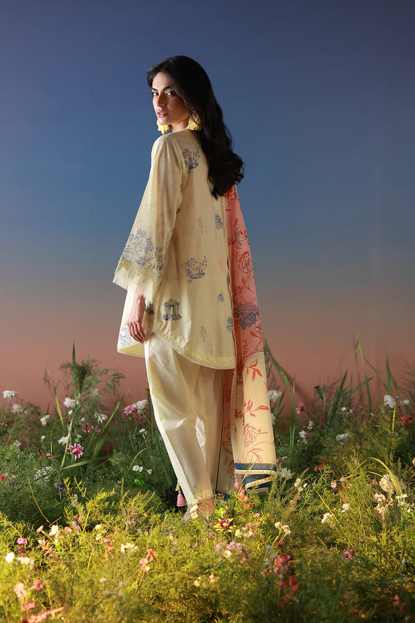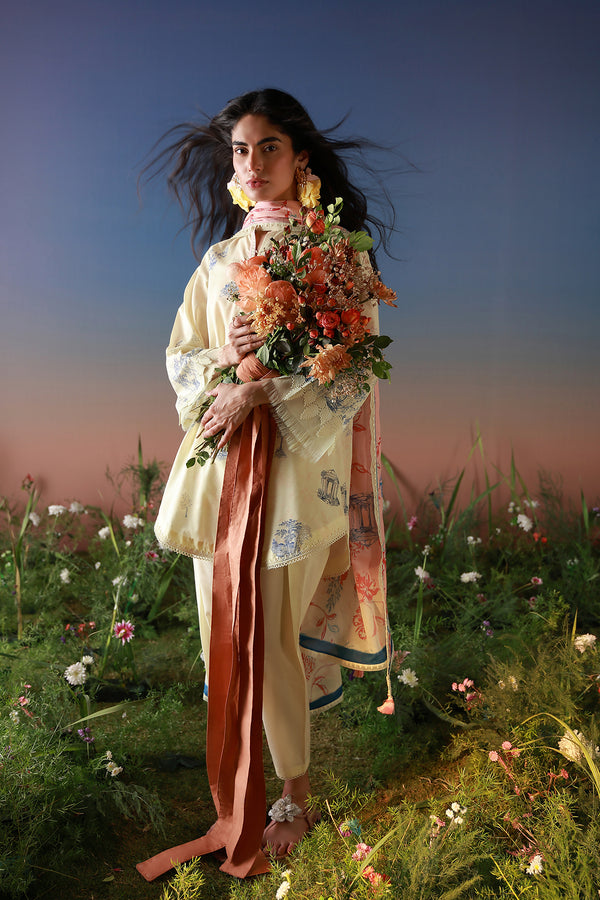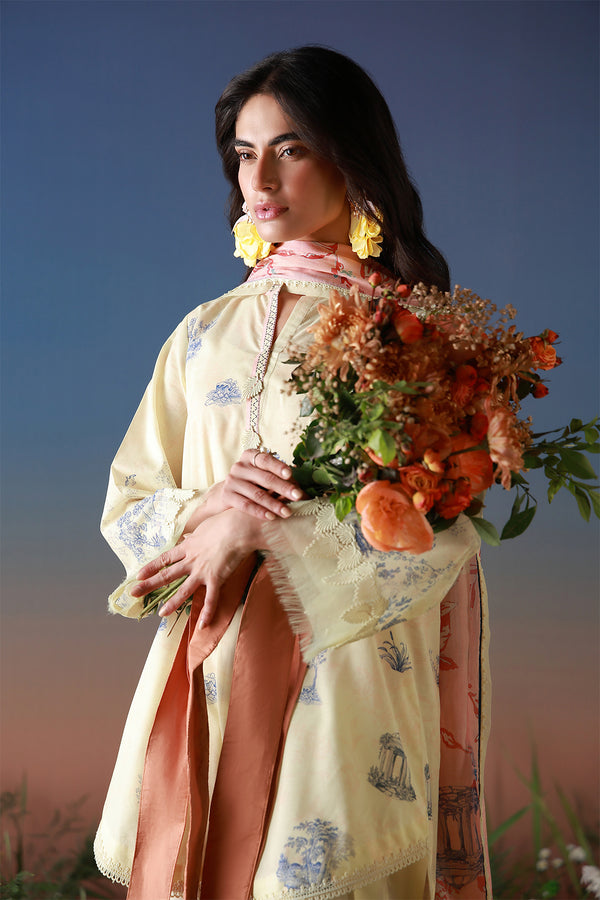 Description: Buttery yellow tones meet delicate blue floral sprigs for a light, breezy aesthetic. The dupatta carries soft contrasts, paired with classic pants for ease. Understated, airy, and effortlessly wearable.