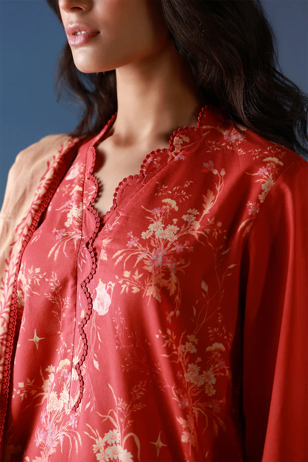 Description: A rich, deep red canvas adorned with tonal florals and heritage-inspired detailing. Styled with matching pants and a fluid dupatta that enhances the depth of color. Bold, festive, and undeniably striking.