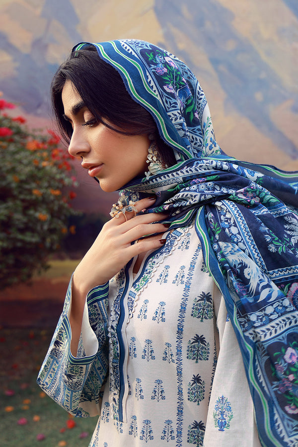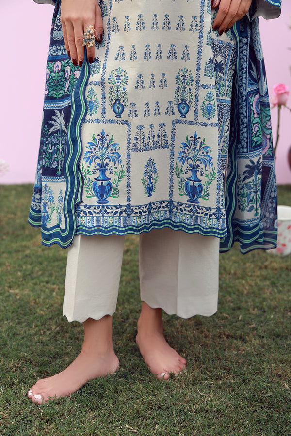 Description: A crisp white base infused with blue folk-inspired motifs and decorative panels. The shirt pairs with clean trousers, while the dupatta completes the artisanal story. Fresh, structured, and timeless.