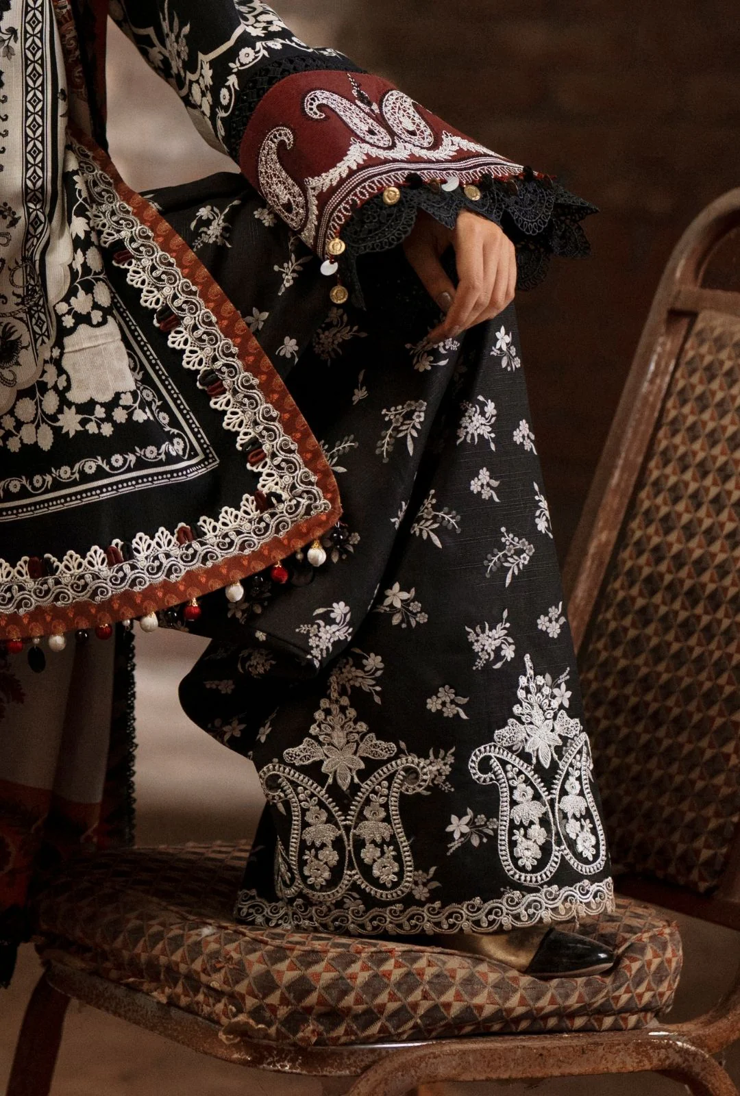 An ivory khaddar fabric shirt adorned with black printed elements, paired with black sleeves detailed in ivory prints – a perfect balance of grace and contrast. A floral mix with paisleys, touched with deep maroon printed accents, adds a layer of luxury. The look is elevated with embroidered neckline, maroon silk sleeve borders, and delicate embroidered lace on shirt sides. A printed khaddar trouser with an embroidered border completes the set, while the statement herringbone shawl – featuring paisley accents on ivory – wraps it all together in warmth and charm.