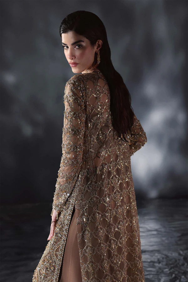 Indulge in sheer luxury with this Couture Mocha Mousse Ensemble, a masterpiece of elegance and intricate artistry. The front-open gown, crafted from delicate organza fabric, is lavishly adorned with shimmering crystals, dazzling Swarovski elements, sequins, and meticulous detailing. Its graceful flow and opulent embellishments create a look that is both timeless and breathtaking. Paired with the gown are raw silk flared pants, adding structure and modern sophistication, and a zarri net bustier, blending traditional charm with contemporary allure. This perfectly balanced combination ensures a statement-making ensemble for the most exclusive events.