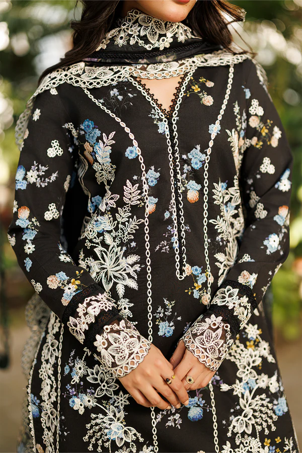 A classic black ensemble elevated with intricate floral embroidery, where delicate ivory and soft blue motifs bloom across the surface with refined detail. The long, straight-cut shirt is framed with ornate embroidered borders that add structure and contrast, while fine embellishment along the neckline and sleeves enhances its elegance. Paired with coordinated trousers and a sheer dupatta edged with complementary embroidery, the look feels balanced and graceful. Set against a natural backdrop, the ensemble embodies timeless sophistication — effortless, versatile, and rooted in artisanal craftsmanship.