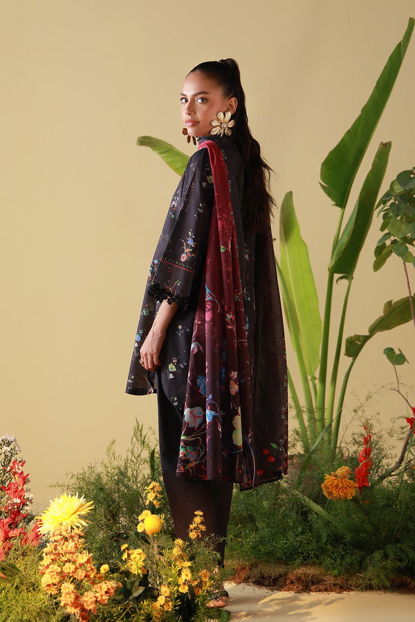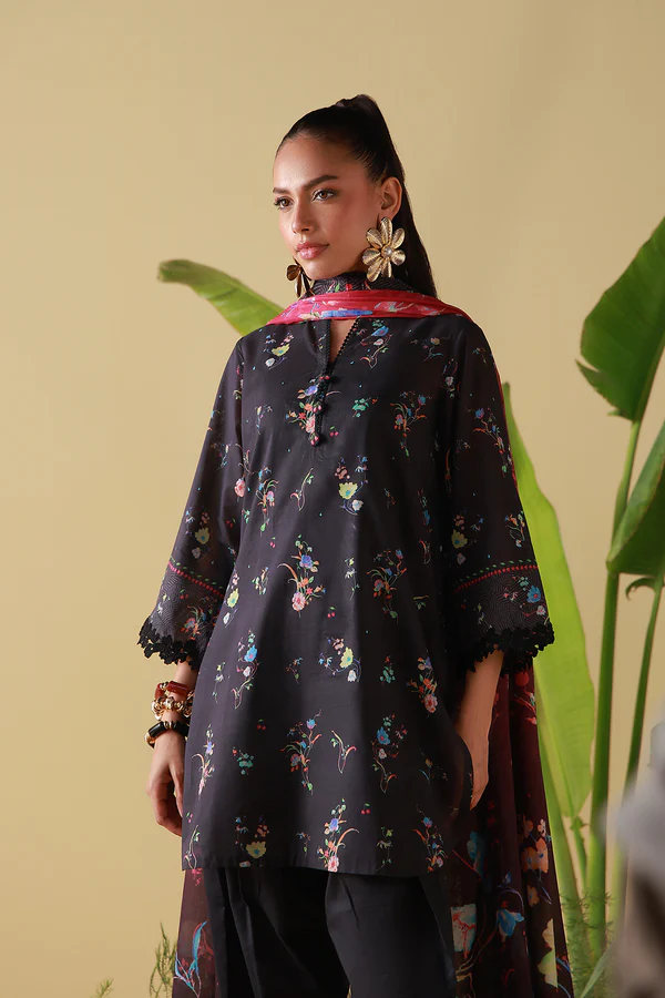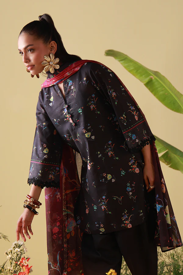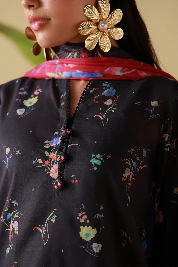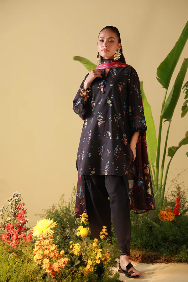 Description: Deep black accented with scattered florals in jewel tones for subtle drama. The dupatta adds depth and movement, styled with classic pants. Elegant and effortlessly chic.