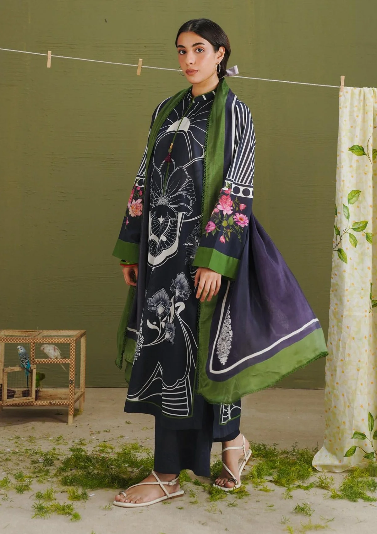 The dupatta is printed in midnight blue with paisley motifs and a moss green border. The shirt features midnight blue and white art nouveau inspired prints. The trouser is finished in solid midnight blue.