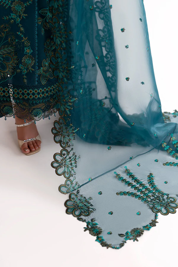 Make a sophisticated statement with this stunning teal-toned Korean raw silk dress, featuring rich multi-teal embroidery that adds depth and timeless artistry. Delicate lace detailing along the neckline and panels enhances its elegance with a graceful finish. Paired with matching culottes in the same luxurious fabric, the ensemble offers a modern, comfortable silhouette that perfectly complements the shirt. A light, sheer embroidered organza dupatta completes the look, echoing the shirt’s intricate threadwork and adding an elegant, airy touch.