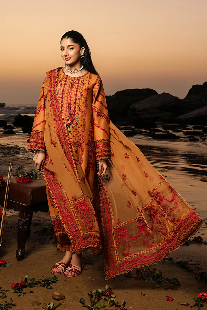 Rich and dramatic, this ensemble features an embroidered lawn front in warm amber tones, paired with a plain lawn back and embroidered sleeves. The embroidered chiffon dupatta adds elegance, while the plain cotton trouser ensures ease. Finished with organza borders, the design reflects bold sophistication.