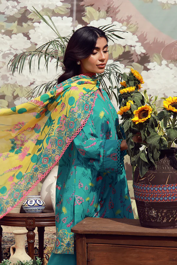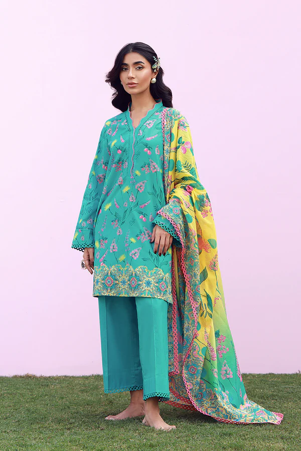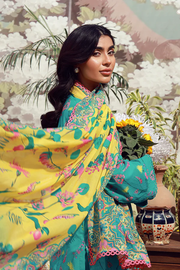 Description: Vivid turquoise infused with playful florals and lively accents. The contrasting dupatta adds energy, paired with matching pants for cohesion. Bright, youthful, and full of charm.