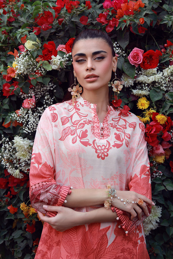 Description: A soft blush-pink ground infused with bold coral florals and tonal foliage. The contrast feels fresh yet grounded, with a statement border adding definition. Feminine, expressive, and designed to leave an impression.